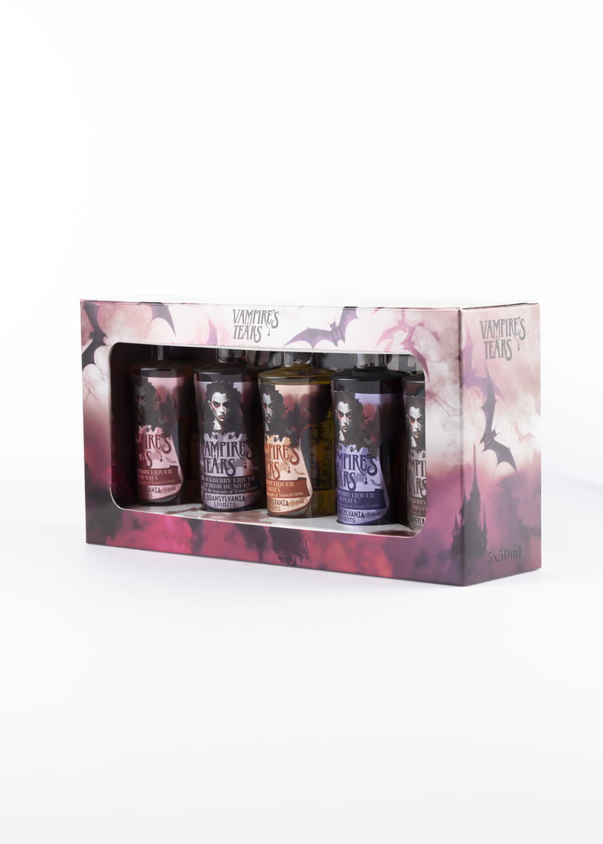 70,18 lei/ BucNote fructate, dulci-acrișoare. Gust catifelat, aromat.Set 5 Vampire’s Tears Lichioruri Dulci (Afinată, Vișinată, Caisată, Căpșunată, Mure) 5×50 ml
